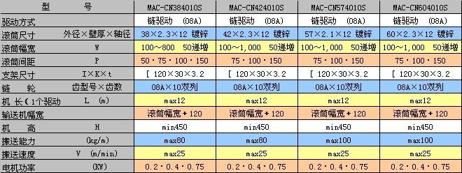 MAC-CN系列鏈條驅動輸送機的滾筒使用摩擦離合式傳動,滾筒和鏈條之間可以有相對運動,以保證搬運的物品停止時,物品和滾筒之間沒有摩擦。