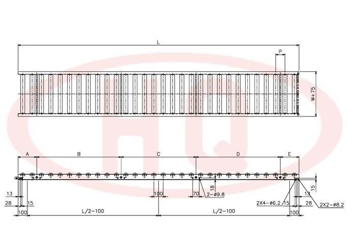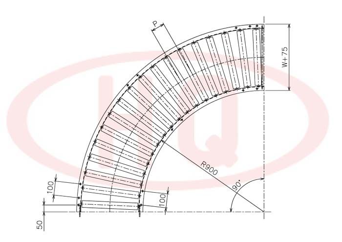 | 型 號 | 滾筒外徑(φ)×壁厚(t) 軸承 | 軸外徑(φ)×壁厚(t) 加工 | 支架形狀I(lǐng)×K×t | 機 長 L | 滾筒幅寬 W | 滾筒間距 P | 轉(zhuǎn)彎半徑 R | |||||