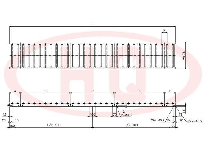| 型 號 | 滾筒外徑(φ)×壁厚(t) 軸承 | 軸外徑(φ)×壁厚(t) | 支架形狀I×K×t 輸送機高 (H) | 機 長 L | 滾 筒 幅 寬 W | 滾筒間距 P | 轉彎半徑 | ||||||